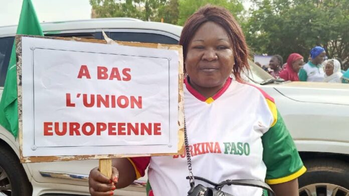 À l’appel de cette faîtière de soutien à la Révolution progressiste populaire et à la dynamique de la Confédération de l’Alliance des États du Sahel (AES), plusieurs citoyens se sont mobilisés dès les premières heures à la Place de la Nation, encore appelée Place de la Révolution. Munis de drapeaux, fanions, posters et autres écriteaux, les manifestants ont ensuite, slogans à l’appui, mis le cap sur le siège de l’Union européenne, sis avenue Kwamé Nkrumah.