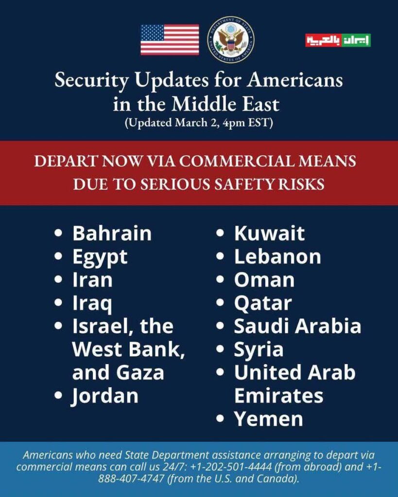 Le département d’État américain appelle ses ressortissants, dans les pays du Moyen-Orient, à quitter le Bahreïn, Égypte, Iran, Irak, Israël, Cisjordanie, Gaza, Jordanie, Koweït, Liban, Oman, Qatar, Arabie saoudite, Syrie, Émirats arabes unis et Yémen, en raison de graves risques pour la sécurité.